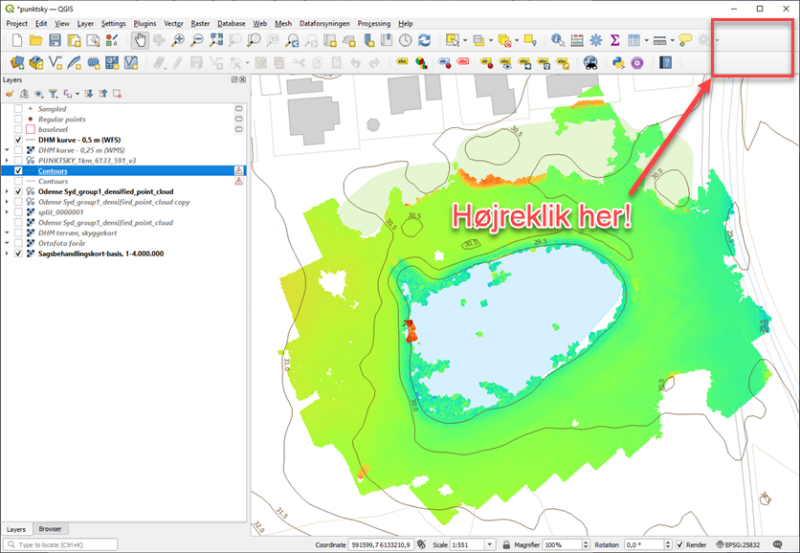 * Ved at højreklikke i et "tomt"/"ledigt" areal i værktøjslinjerne/menuen (se figuren nedenfor).