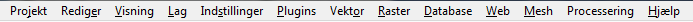 Den nedenfor viste menulinje er standard-menuen i QGIS: