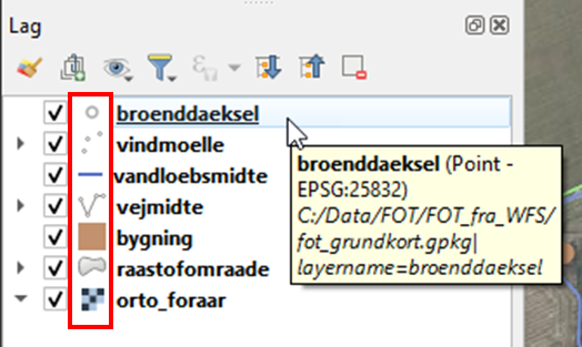 I skærmudsnittet nedenfor ses følgende lagtyper (symbol markeret med rød ramme):