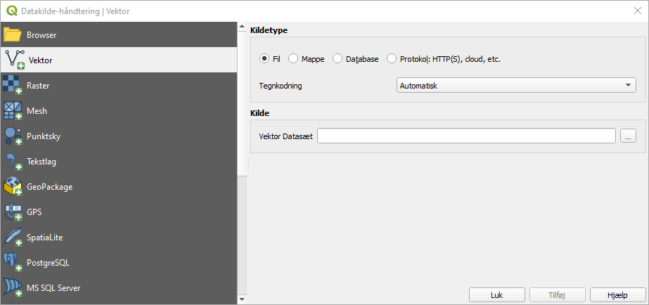 1. Dialogboksen ’Datakildehåndtering’ åbnes, og valgmuligheden ’Vektor’ er highlightet.<br>