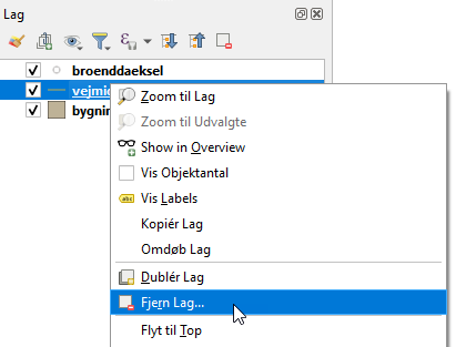 Du fjerner et lag ved at højreklikke på dette i lag-menuen og vælge ’Fjern lag…’, som vist i skærm­udsnittet nedenfor.