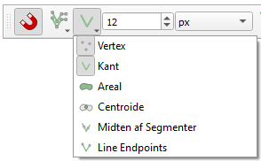 Tredje knap og de efterfølgende bokse anvendes til at angive henholdsvis hvad der skal snappes til og med hvilken afstand. Man kan vælge ét eller flere af de angivne snapobjekter. I eksemplet til højre er der valgt snap til både knude (vertex) og segment (kant).