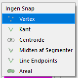 2. Vælge om der skal snappes til ’Vertex’, ’Kant’, ’Centroide’, ’Midten af segmenter’, ’Line endpoints’ eller ’Areal’ \[1].
