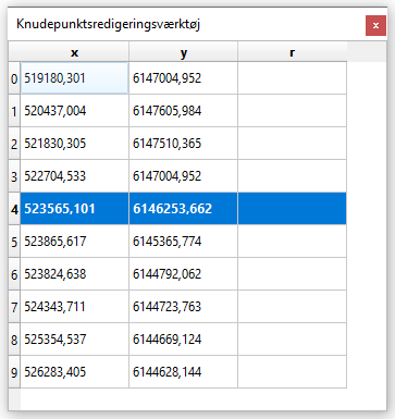 Her kan man tilgå, aflæse og editere koordinaterne på de enkelte knudepunkter direkte - både ændre koordinaterne og slette enkelte knudepunkter.
