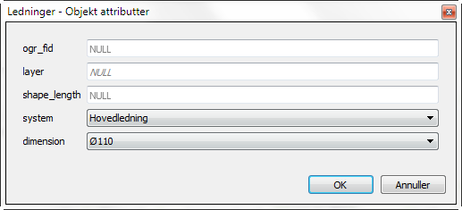 Når man afslutter objektet med højreklik (eller efter indsætning af et punktobjekt), vises en dia­­log­boks, hvor de ønskede attributter kan inddateres: