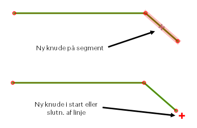 **Tilføje knudepunkter:** Man tilføjer et nyt knudepunkt imellem to eksisterende knudepunkter ved at pege og klikke på det plus, som dukker op midt på et linjesegment, når man holder musen over dette. Ved første klik oprettes knuden, og den kan nu placeres med endnu et klik.